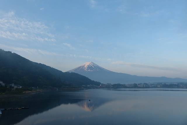 要想看逆富士,比较大的几率是在日出前后,没有什么风,湖面还没有水鸟活动,阳光从东照向富士山,是绝佳的时机。
