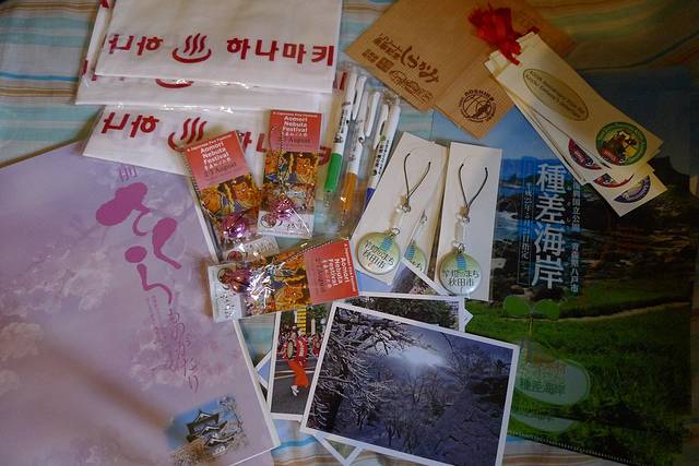 此行领到的礼品,共计:秋田的手机链屏幕擦、能代的杉木明信片、弘前的樱花写真集(标价840円)、青森的睡魔铃铛、八户的种差海岸文件夹、盛冈的明信片、远野的妖怪圆珠笔、新花卷的温泉毛巾、仙台的伊达政宗饭团丸书签