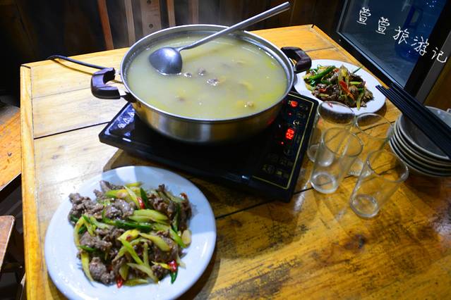 一鸡两吃,还有一锅黄焖的还没上。再抄两个小菜,喝点当地的米酒。美哉美哉。老板在我们吃饭的时候送上他们这里自酿的糯米酒,用的是这里的山泉水和自己种的糯米,没有任何的添加剂和香精,等我们吃完晚饭,店家已经都关门了。本来还打算出去逛逛的,老板说现在是淡季,外面没什么人,而且又黑又冷,还是不要出去的好。又想想第二天还要起早看日出就算了,还是早点休息吧。