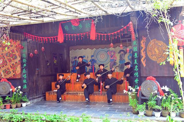 游完漓江,我们驱车1小时来到了位于桂林至阳朔之间的世外桃源.世外桃源的游览很简单,入园之后有专门的导游给你讲解,然后是到风雨桥的旁边坐船只游览整个村子,大约半个小时左右。沿途能欣赏到不同民族的表演,导游教给我们不同民族打招呼的语言,我们在船上乱喊一通。呵呵。船到鼓楼之后,我们开始上岸。在鼓楼门口喝了什么米酒,不太好喝。然后开始岸上游览,每个地方有不同民族的人在表演他们特有的东西。不可否认,世外桃源有很多人为的因素在里面,但是建设者能巧妙的把人为的东西跟自然相结合,这也算是一种莫大的成功。