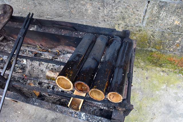 竹筒饭的竹子都是老板现砍的,掏空后放满调制好的米,如五谷杂粮、腊肉香肠等,封口后在火上烤30分钟左右,随后浸入凉水中降温,劈开后即可使用。
