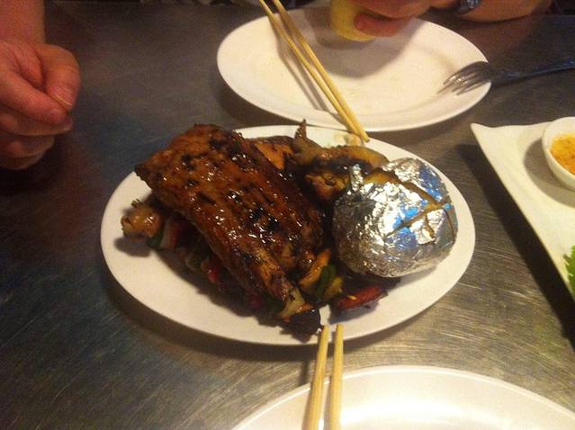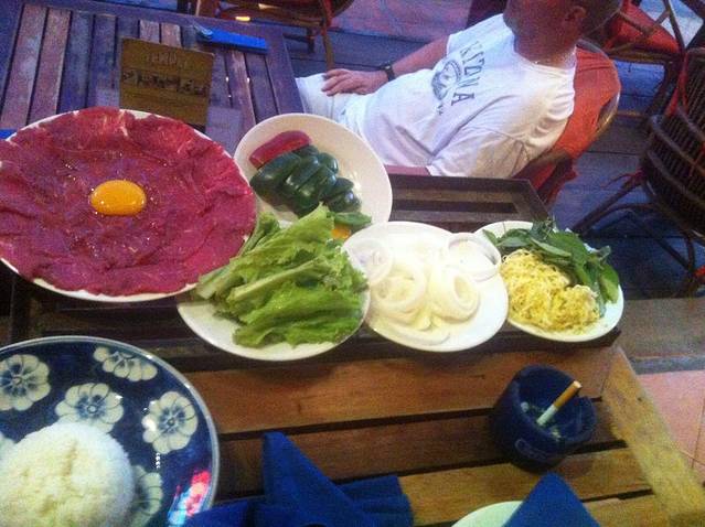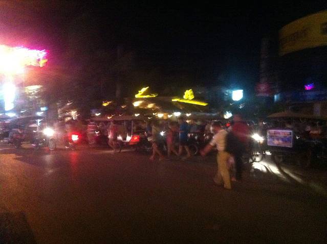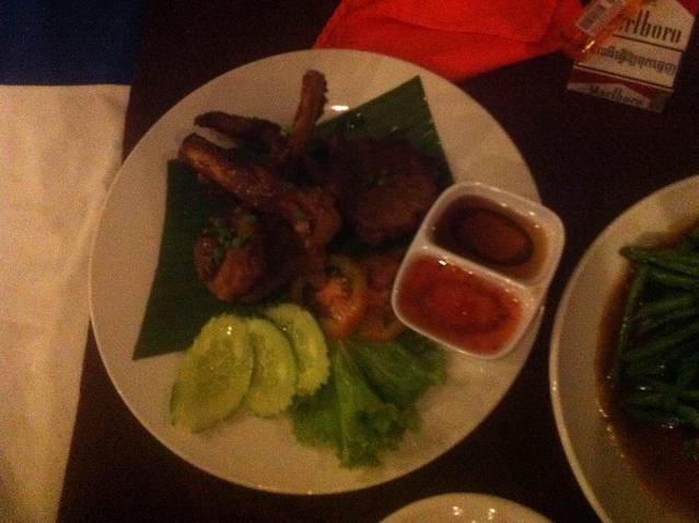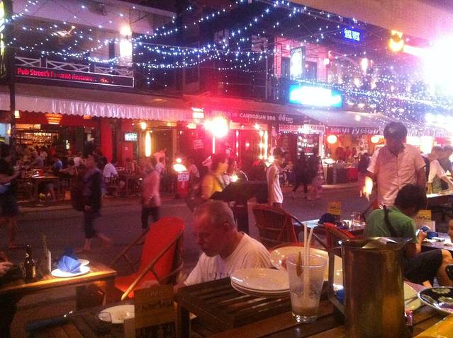 回酒店洗了澡,出门觅食。今天去品尝一下柬埔寨BBQ,逛到酒吧街,找到一家比较大、人比较多的店。点了柬埔寨火锅和高棉BBQ,吃下来感觉味道一般,有些小失望。