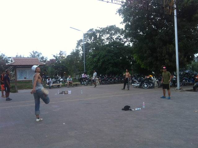 老市场南面的河边有很多年轻人在玩踢毽子,水平很高,动作很花哨