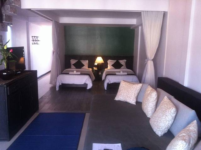 我们住在二楼的一个2层的复式套房,楼上一个大床,楼下2个单人床。而且楼上楼下都有卫生间和浴室。三个人住,性价比很高。