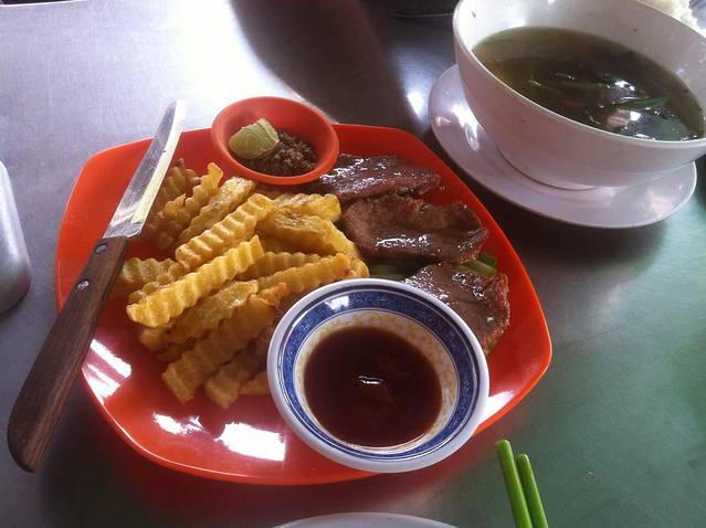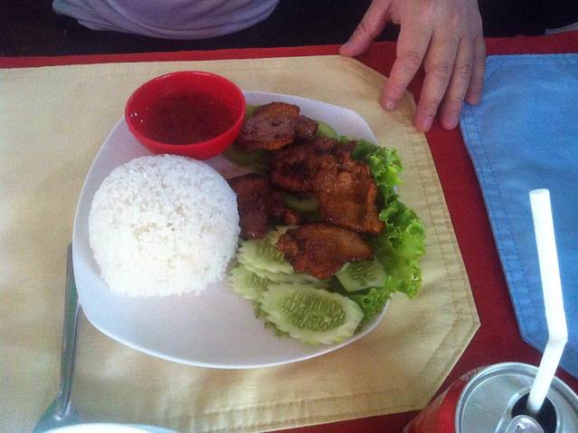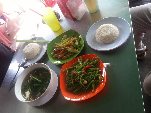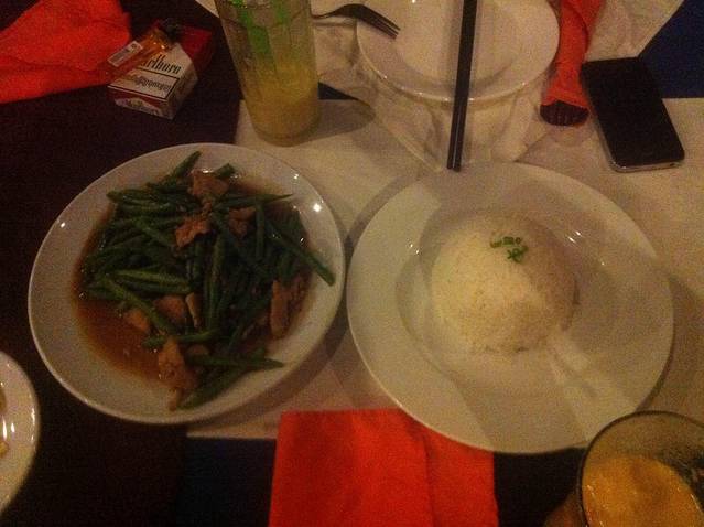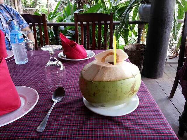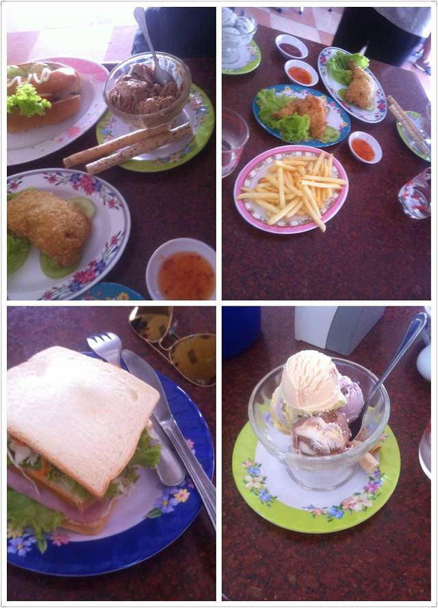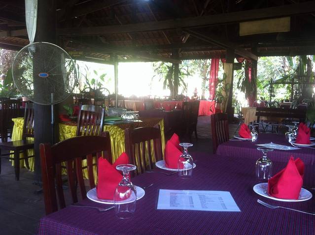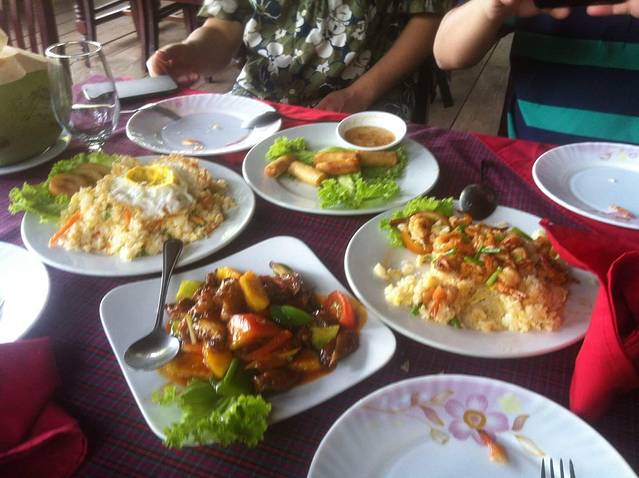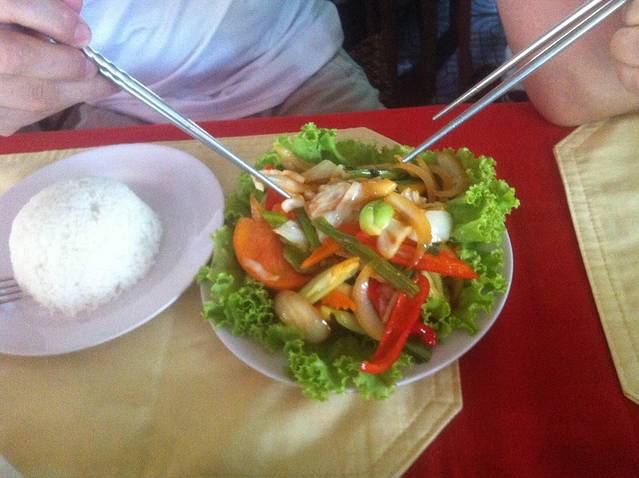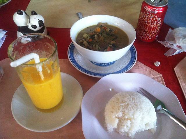 下山到出口已经12点多了,2个小时山路下来我和我的小伙伴都饿的不行了。本来Lam打算带我们去崩密列吃午饭,他说那里小饭店多,价格也便宜。但是从高不斯滨到崩密列要45分钟车程,我们实在饿的不行,就要求Lam在附近找一家饭店。在这里要说一下,在柬埔寨司机还是很有职业道德的。司机一般不会和你一起吃饭,他们只会带你去他们熟悉的饭店,为的是饭店会给他们一份非常简单的工作餐。不过你放心,柬埔寨人还是很纯朴的,景区的饭店和小卖部里的东西价格和景区外都差不多或是稍搞,这和天朝喜欢在景区宰客有很大不同。言归正传,Lam带我们去了附近的一家饭店,停完车,我们下车Lam却不和我们进去,他说这里太贵,他要去甭密列吃。我们当然不答应,硬把他拖了进去。进去后点菜,Lam点了一份最便宜的炒饭,还强调一定要他自己付账,我们很感动,但是我们还是帮他付了。这一顿是我们在柬埔寨吃得最贵的一顿,但是回国后我们再次讨论在柬埔寨的美食,也一致认为这是最美味的一顿。可能是我们都太饿了,但是那家饭店的味道也确实很好。