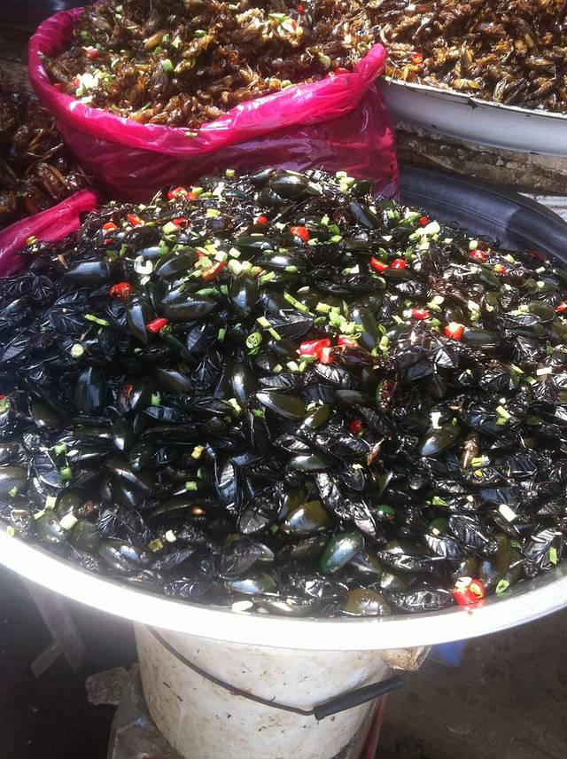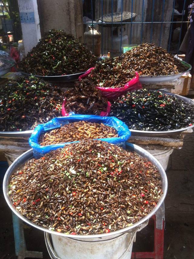 中途停车休息,下车逛逛,路边有卖昆虫小吃。我们车上一个当地人就买了一包在车上吃,我实在没有勇气尝试