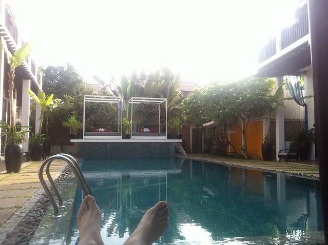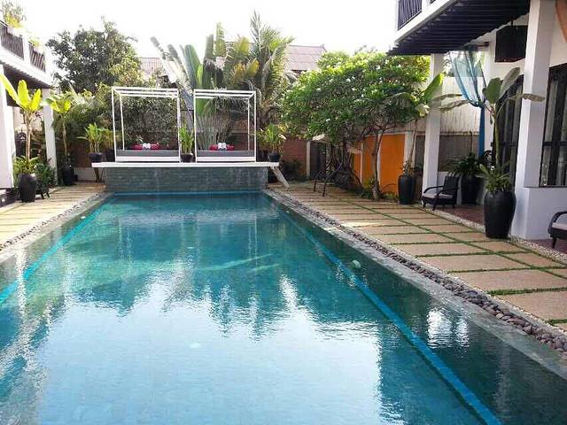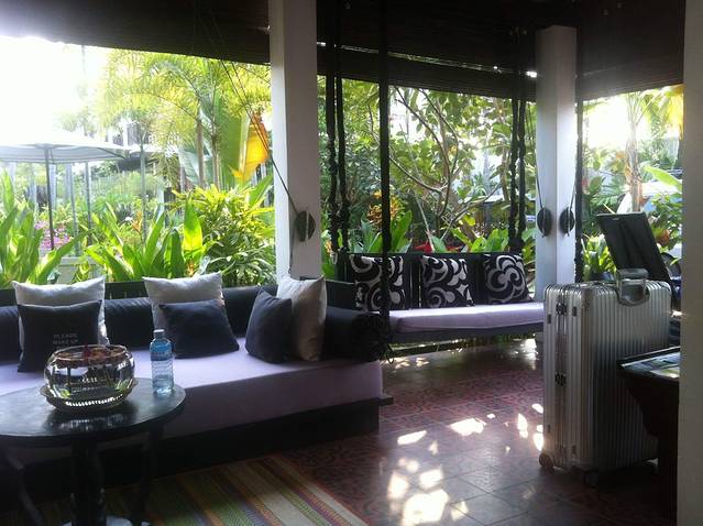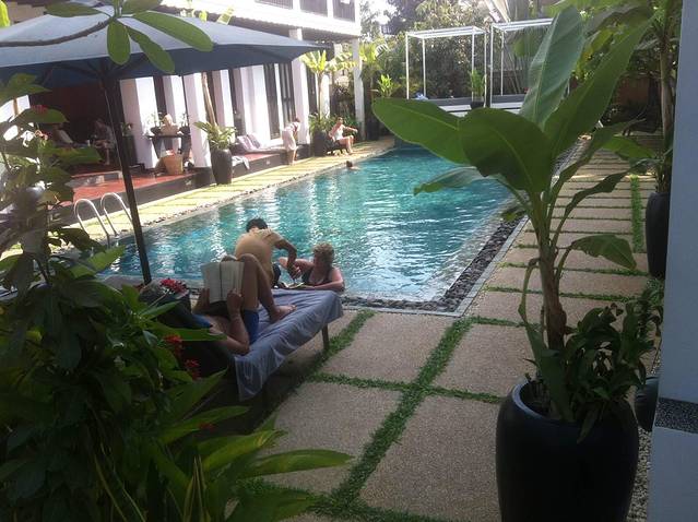 Sam把我们送到酒店。酒店在午夜市场的北面,一个小巷子里,叫“穆尔贝里”,说是酒店,其实像一个家庭旅馆。三栋小楼,一共也就十来套房。绿化很好,很干净,还有游泳池。我们订的套房,可以住4-5个人,6晚折合人民币共5900。