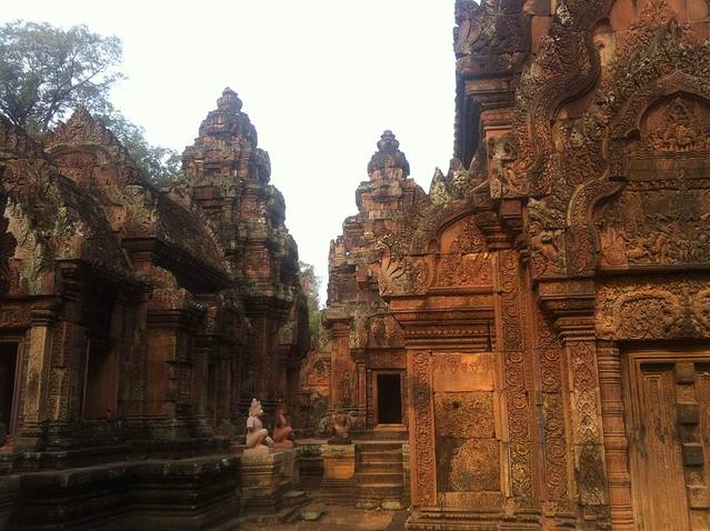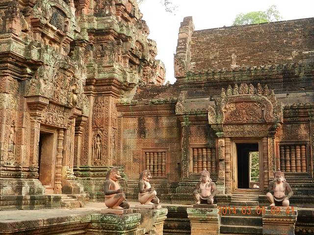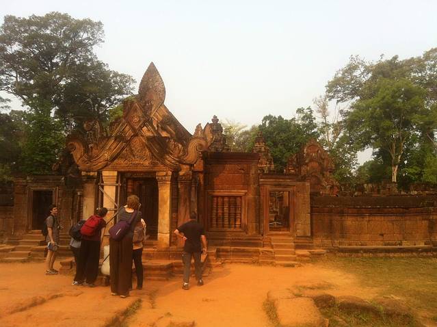 女王宫是国王为国师建的家庙,供奉湿婆神和毗湿奴神。好像它是唯一一座面向东面的寺院,所以一定要早上去,因为朝阳照在用红土和红色砂岩建造的建筑上,会让人感觉到中央寺院如同正在燃烧的火焰一般。但我建议最好在九点以前参观,因为女王宫是一座小型寺院,但又是旅行团必去景点。九点半过后大批团队游客过来,会比较拥挤。