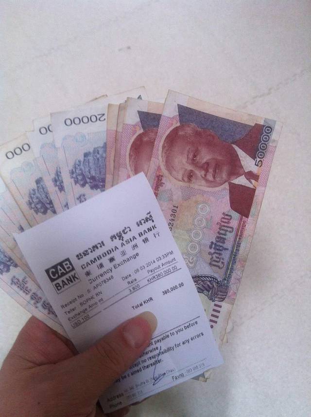 五:柬埔寨货币是瑞尔,但主要流通货币却是美元!刚下飞机立即在机场换了100刀的瑞尔,汇率是1:3800。但一出机场傻眼了,柬埔寨所有的餐厅、超市连小摊标价都是美元,只有小于1美元时,才把小面额的瑞尔当零钱用。而且市面的汇率是1:4000。可怜我的瑞尔大钞用了3天才花完,汇率还亏了不少。