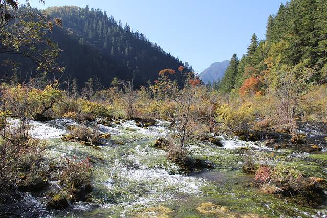 相比三月进沟那次天气不好,花草树木尚未生长,十月的九寨就是一个五彩的世界,让人流连忘返,陶醉在每一副山山水水的画面中.这次运气实在是好到爆了,天天都是大晴天,想找一朵云都是非常困难的,老天一定是补偿第一次九寨沟之行的遗憾吧.