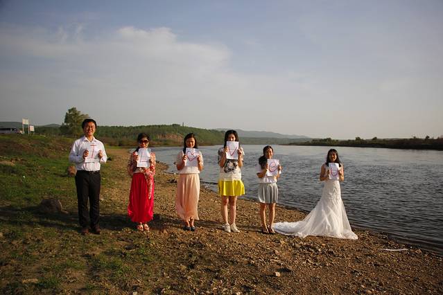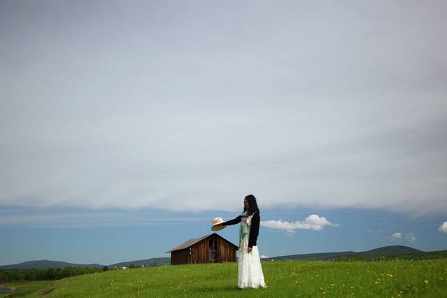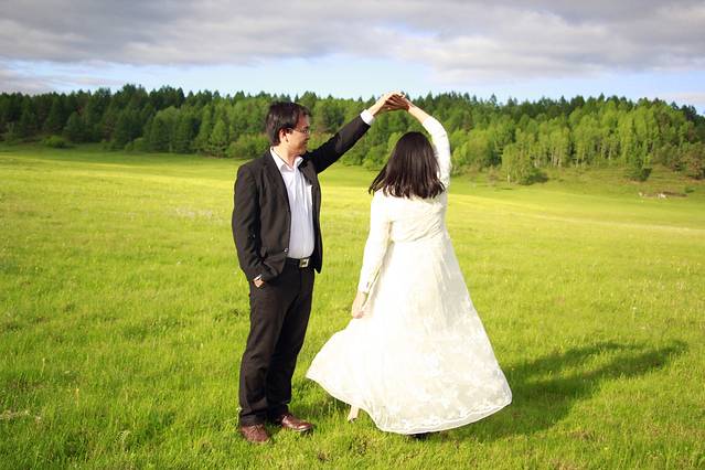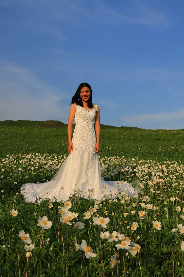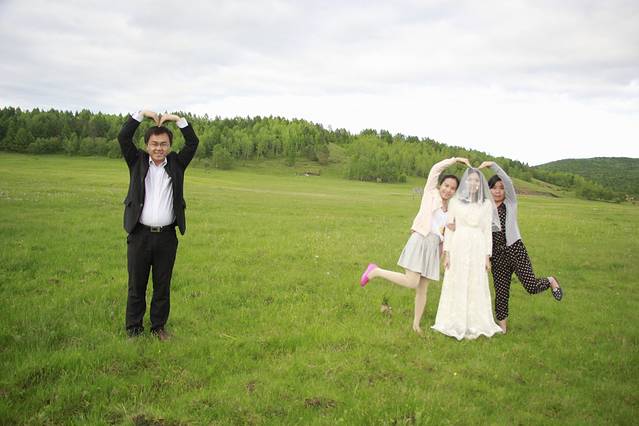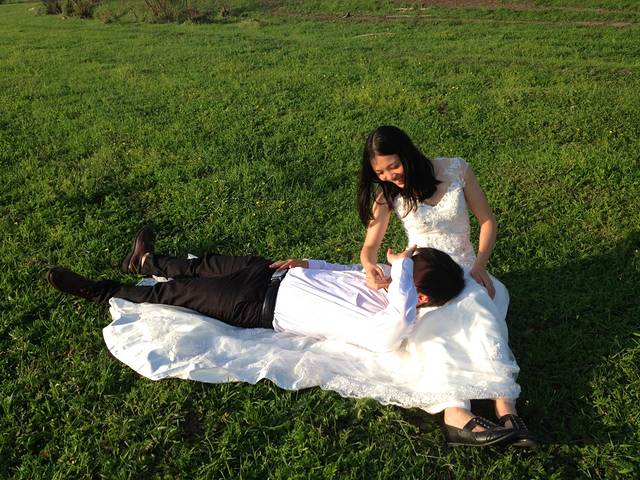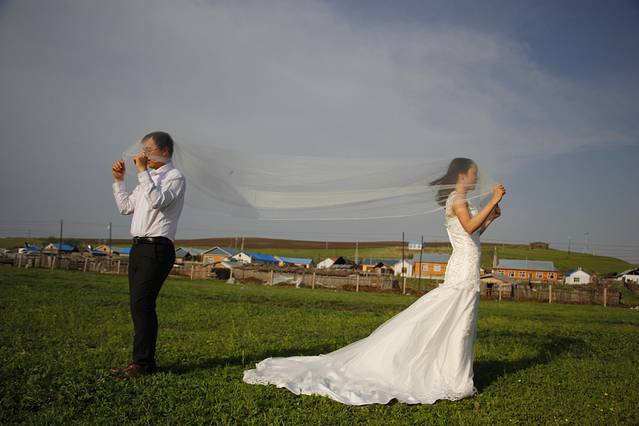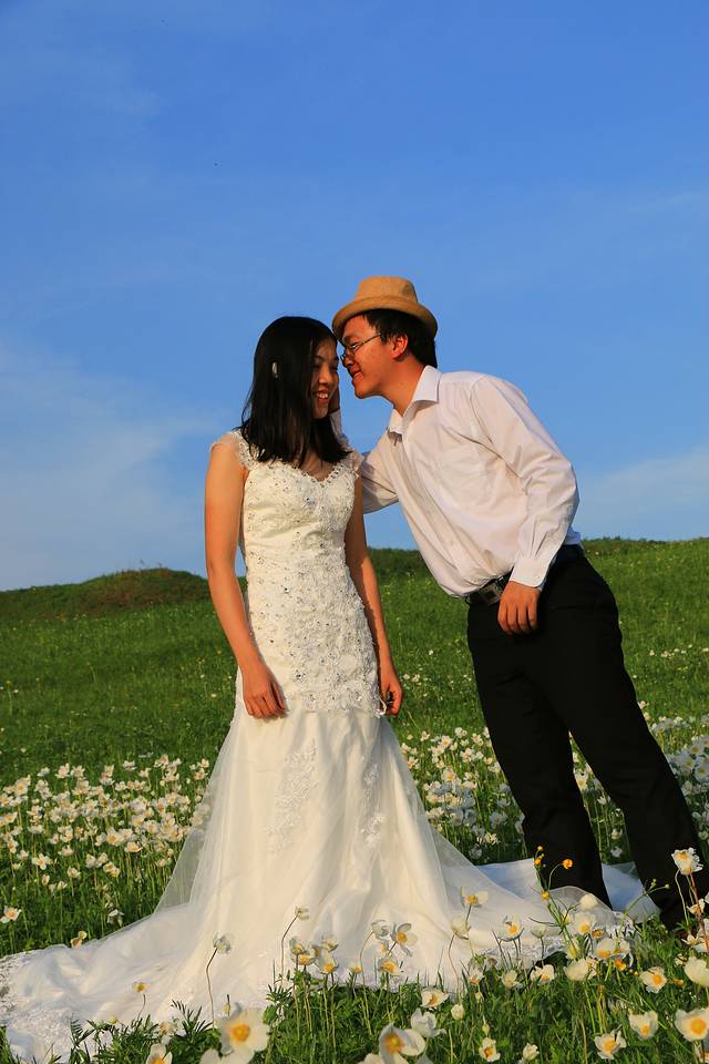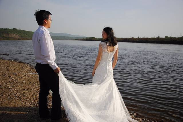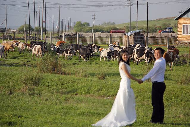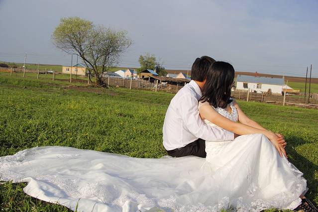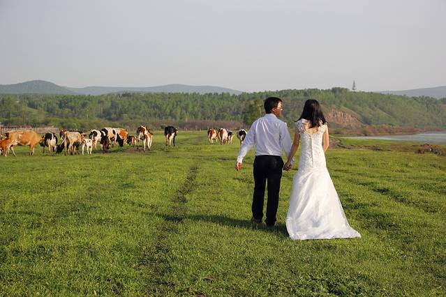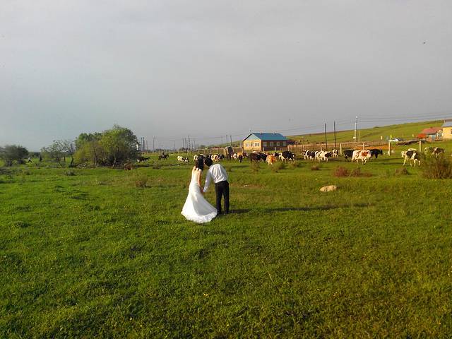 在车上换好了婚纱,陈哥哥换了衬衫,阳光太强烈,刺得根本睁不开双眼。始终进入不了状态,在河边拍了几张,跑到岸上的草地上,背景是一群牛和小屯子。最后干脆豁出去了,不摆拍,随意走着,让媚自己抓拍,听到快门在“咔擦”、“咔擦”地响着,也不知道拍了多少张,也没有去看效果,整个旅途中只要能有四五张就已经足够了。