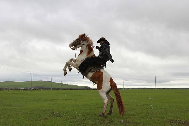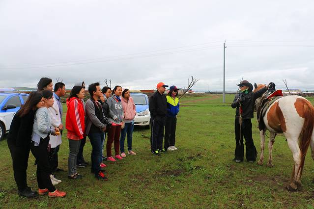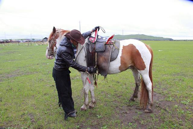 吃了早餐之后,雨竟然奇迹般的小了,老毕让我们把行李放到车上,就可以到马场去了,马帮帮主骑着高大的马,帅气地在前面开路。马场很开阔,风从四面八方灌过来,我们一边冷得瑟瑟发抖,一边听马帮帮主解说骑马的注意事项。王师傅看我冷得难受,脱下自己的外套给我穿上,自己在一旁也冷得直哆嗦。