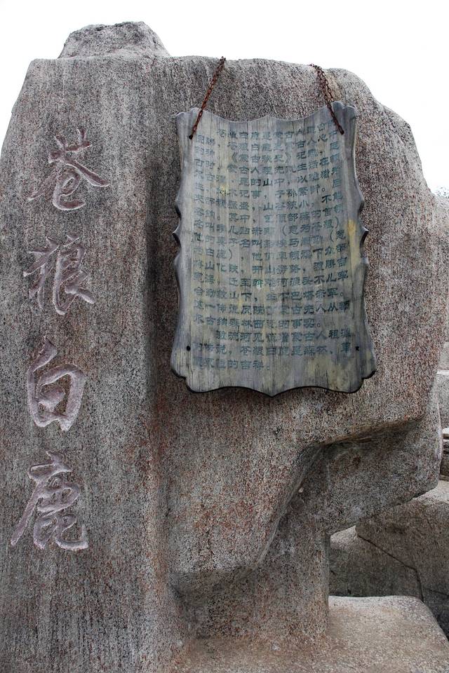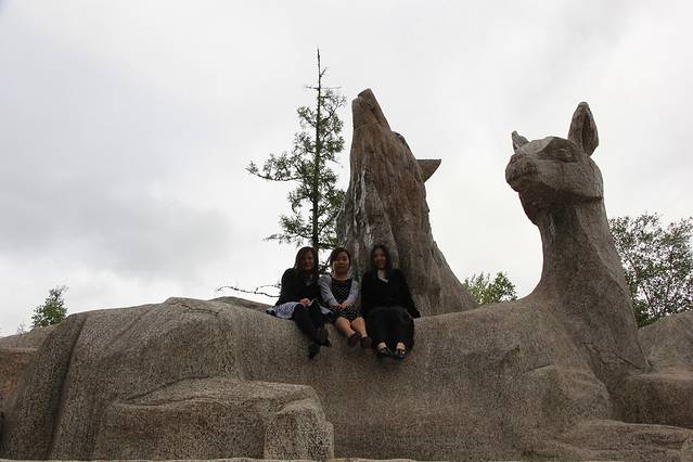 然后我们果然看到了鹿,还有一匹狼,用大石头雕刻的苍狼与白鹿伫立在路旁,苍狼白鹿是蒙古人心中的神,是古时的图腾。在莫尔道嘎森林公园内,激流河注入额尔古纳河入河口上游处,有两个修长小岛相偎而卧,就是苍狼、白鹿岛,当地百姓为此创作了许多传说。