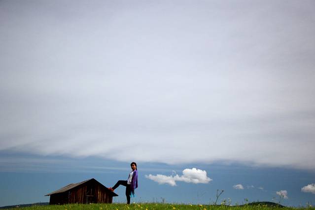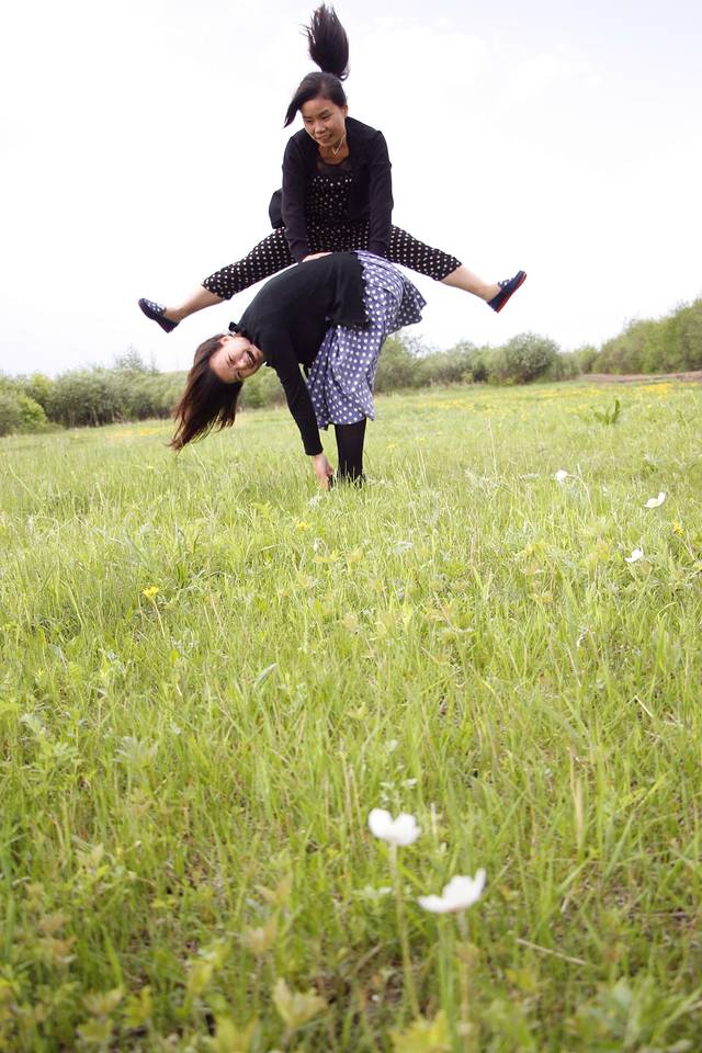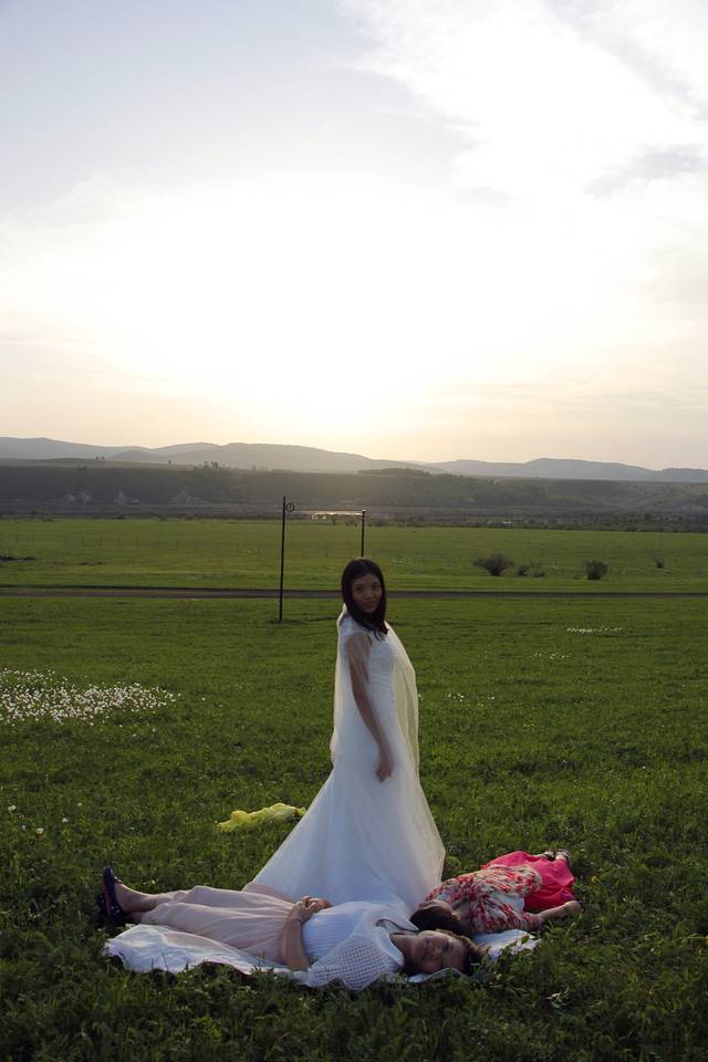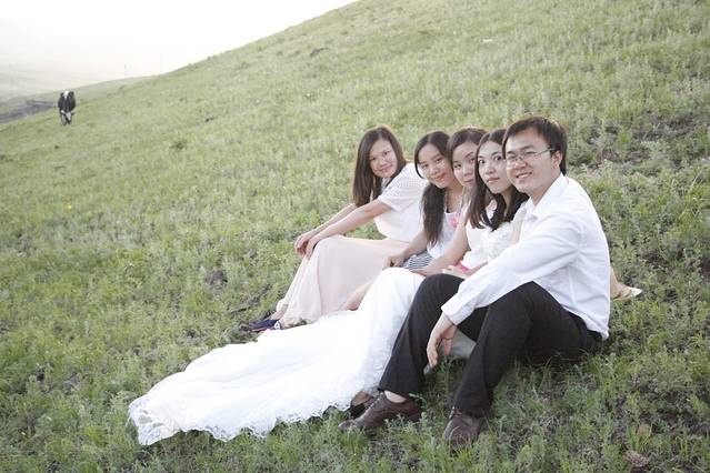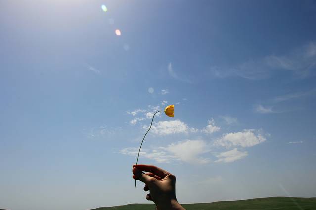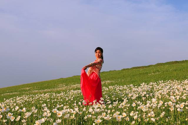 老毕他们似乎收获颇丰,才不一会儿,他就开车过来接我们,恰巧被兵哥哥赶,说这边是禁区,不允许进去。老毕带我们到了一个开满野花的小山坡,拿起相机就对着我们,一边拍一边直摇头,说我中午应该洗头,我应该化妆,应该拿一个反光板……我在心里默想:老毕啊老毕,你不懂我想要的啊,我只是要素颜、简单、随性。