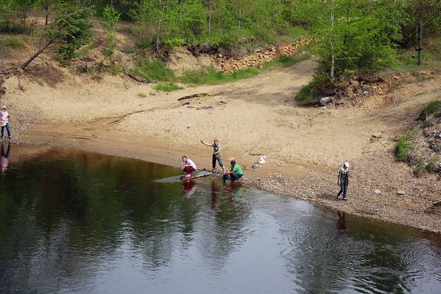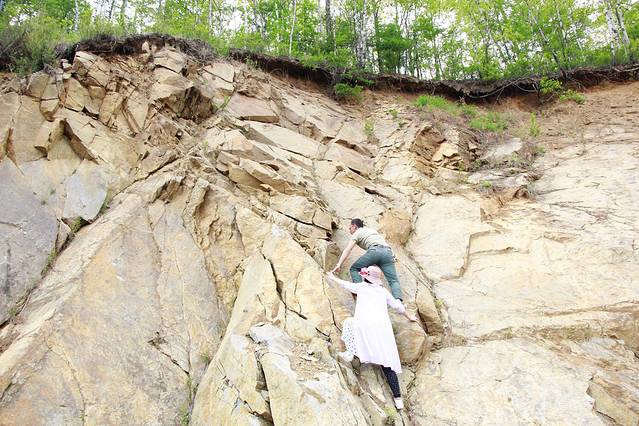 再往前,老毕又将车停了下来,让我们观赏激流河注入额尔古纳河处的景色。他跟我们说能够徒手爬上大岩石,还忽悠了贝囡跟他一块儿爬上去,让我们看了一场“牵手共患难”的好戏。
