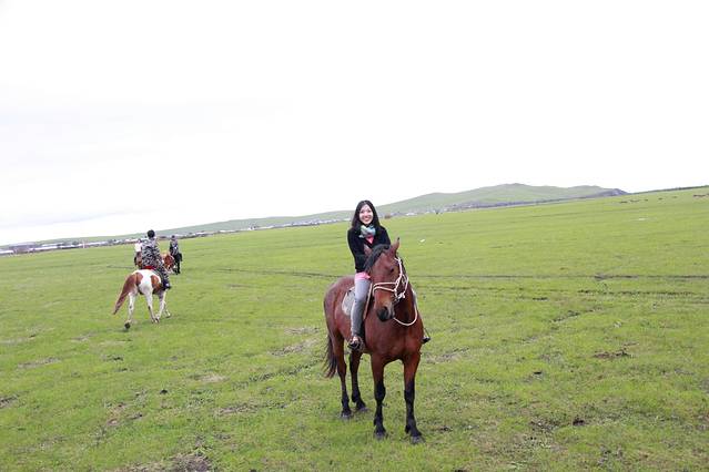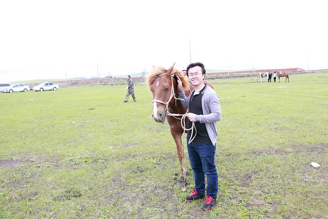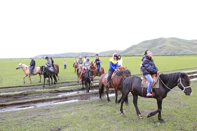 大家都选了属于自己的马,骑了上去,马场伙计带着我们慢慢地走着,刚下过雨,马场湿滑,为了安全不能快速奔跑,不过温顺的老蔫还是满足了我的小小愿望,小跑了几段。其他马都自觉排着队,一只挨着一只,慢慢地走着。