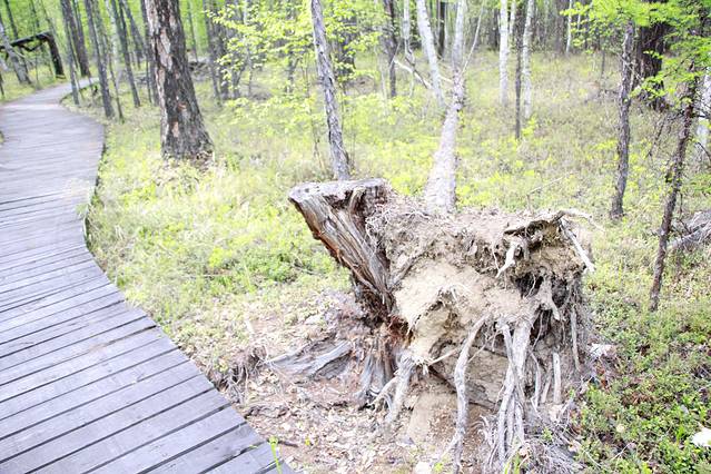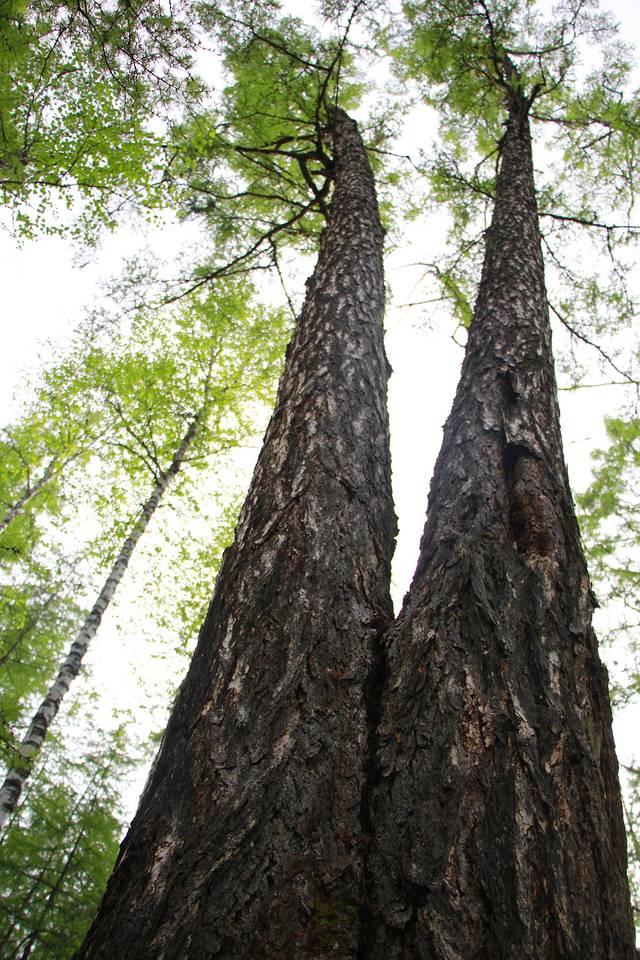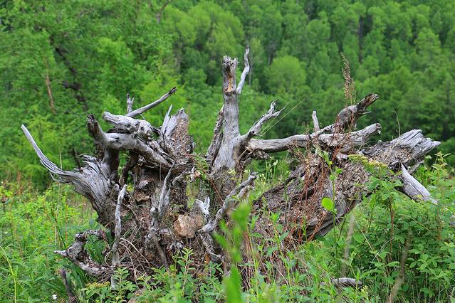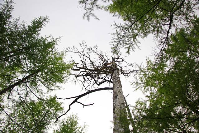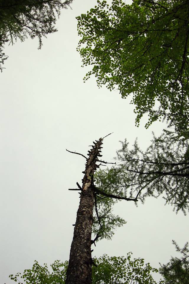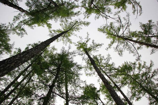 老毕让我们猜猜这些落叶松的年龄,我们以为只有几十年。可是最少的都有两三百年了,带着我们看树的年龄,又忽悠我们一圈一圈地数。还有很多已经死掉的树木,已经没有任何叶子,干枯得剩下树干,只是始终都没有倒下。树木成长不易,养护森林真的很重要,大家千万不要带着明火进入森林。