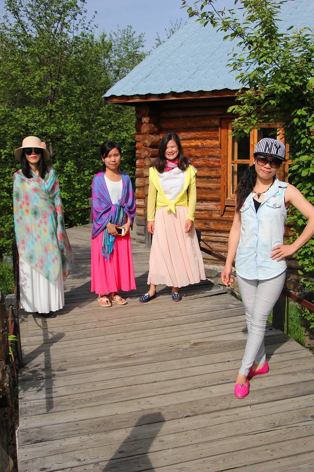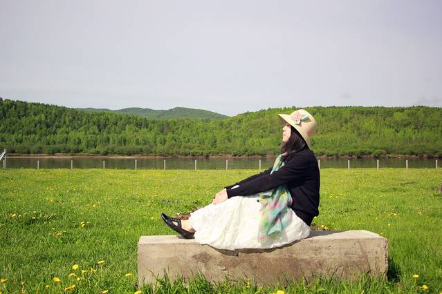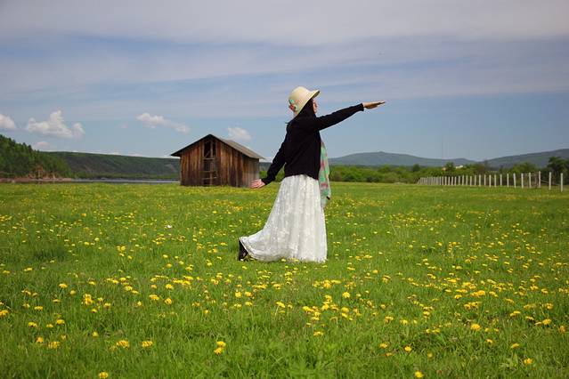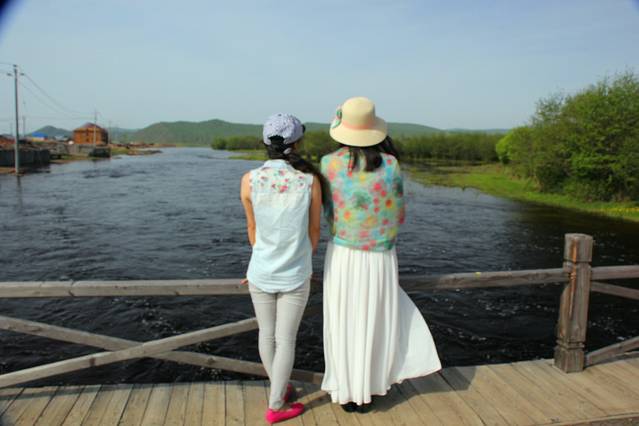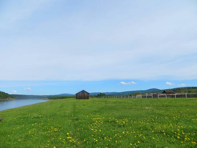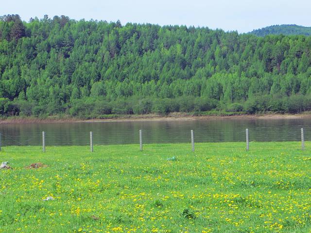 吃过早餐,等姐妹们起床,我们慢悠悠地往河边走去,对面俄罗斯翠绿欲滴、蔚然成林;额尔古纳河静静地流淌,横贯在中俄之间;河岸边是丰美的花草。驻军的军营,营里的狗儿,几所小木屋,屋子前面堆齐的柴,栅栏围成的土地,门口的拖拉机,屋旁的动物们……一切都显得不真实,如同闯入了画境之中。