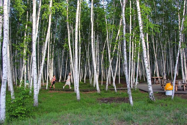 进入林区,一路上设了很多管护站,在莫尔道嘎太平管护站,老毕下车跟工作人员打招呼,让我们通行。顺利通过了,一路上都是郁郁葱葱的树木,我还跟陈哥哥打趣,从呼伦贝尔回去之后,近视的度数就会回升了。天空依旧阴沉,风从微启的窗中吹进来,清爽扑面而来,我们尽情呼吸着新鲜空气,情绪瞬间又高涨了。