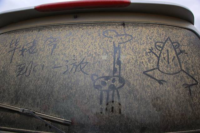 车内气氛很沉重,老毕让我们下去转转,雨还是不停地下,完全没有下去的欲望,王师傅在老毕后车窗写上了“毕姥爷,到此一游”,赵大哥几笔画上了一只长颈鹿跟一只青蛙,栩栩如生。