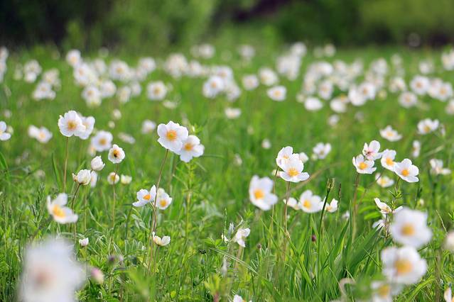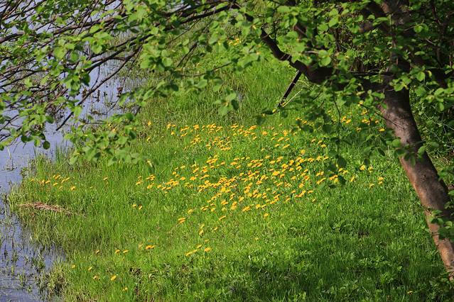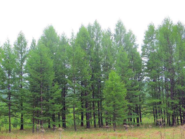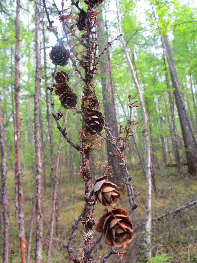 落叶松枝掉落在地上,已经形铺成了一片地毯,踩在上面,柔软舒适。林子间长满了各式各样的小花,松果随处可见,一串串干枯的松果成了一个个艺术品。