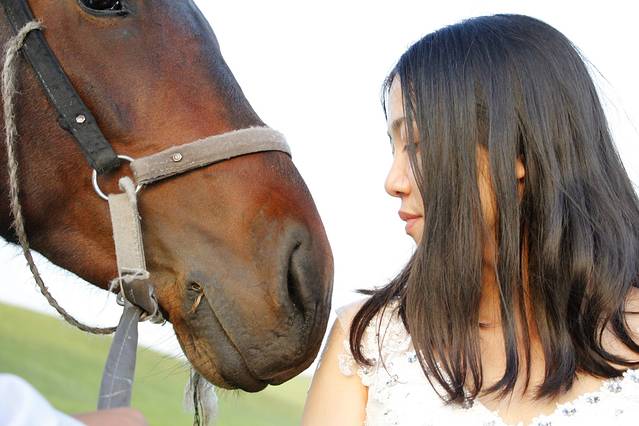 讲解、示范了几个动作之后,马场的伙计把马牵了过来,我选了一条叫“老蔫”的深棕色马,他说那是马场最温顺最乖巧的马,这样的马就合适配胆小如鼠的我。娟娟选的马叫“小七”,是黑色的,陈哥哥的叫“梁子”,在上马之前要先跟马好好培养感情,牵着它慢慢闲逛,多抚摸它,跟它说说话,这样比较容易驾驭。