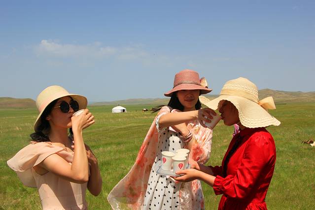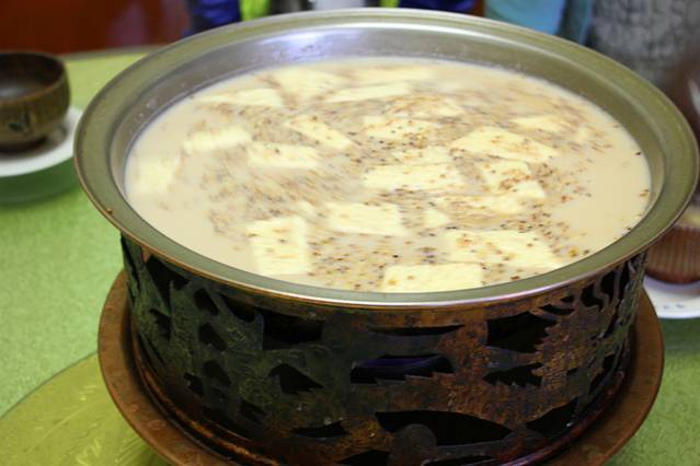 早餐挺丰富,却没有多少胃口,喝了两碗锅茶,很浓郁香醇。锅茶就是将将酥油、奶豆腐、奶酪、炒米等料一样样放进锅里,反复搅动,然后把煮好的奶茶倒进铜锅继续烧开。老毕说,蒙古人早上很喜欢喝锅茶,晚到了就喝不了了。