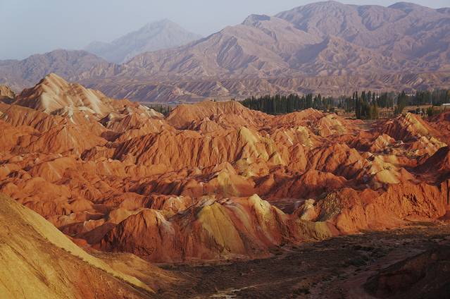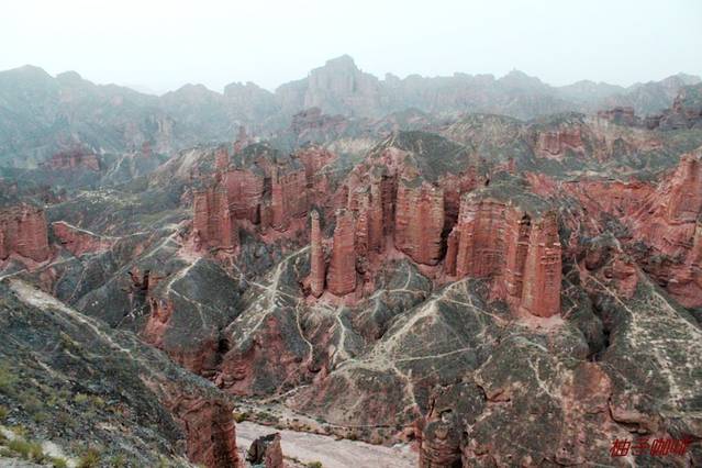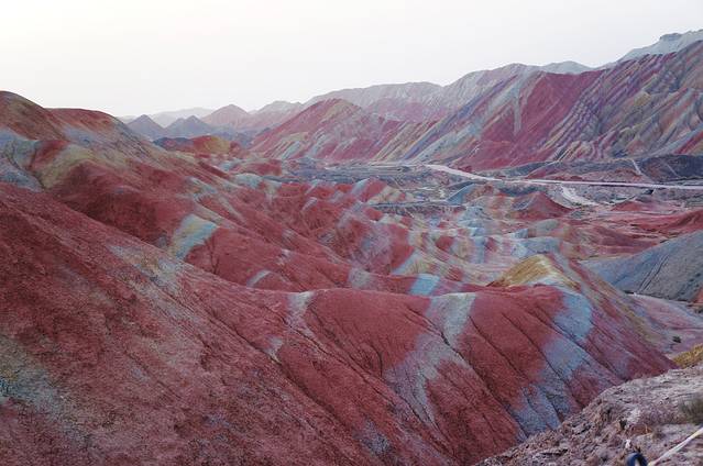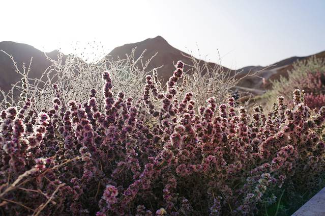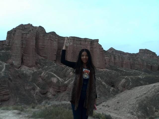 两个多小时一晃就过去了,我们跟老爷爷、老奶奶告别,并祝愿他们拥有愉快的旅程,施大姐已经等在车站门口。见面之后她问我们去不去冰沟丹霞,如果去的话每个人加多十块钱就可以了,大家商量了下便决定去,太阳被云层遮住了,看样子也看不到完整的日落。我跟启鹏、楼、柚子一同坐着施大姐的车,剩下的分别坐另外两部,施大姐一路上跟我们高声阔谈,经过一条河流的时候还告诉我们叫黑水河,跟额济纳的黑水河是同一条。途中,切拉那部车的司机告诉我们他们不去了,直接回家庭旅馆。准备到景区的时候,路两旁的山已经开始呈现出鲜艳的颜色和奇怪的形状。楼和柚子举着相机不停地拍,大姐一边给我们介绍,冰沟丹霞以貌取胜,七彩丹霞以色彩取胜。冰沟是一条峡谷,峡谷都是丹霞地貌,经过长年累月的风吹日晒,形成了各种各样的形状的山体,冰沟丹霞是新开发出来的,所以人不多,何况我们到的时候已经临近傍晚。