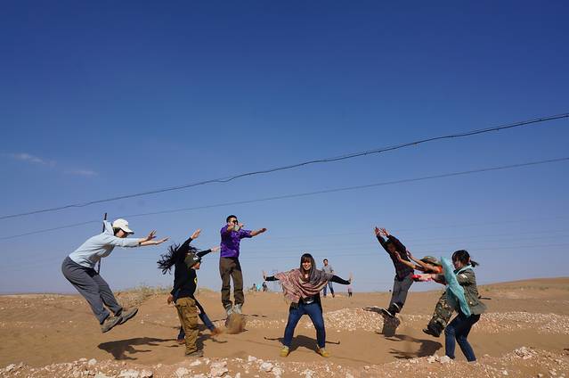 车子偶尔停停,领队让下车休息,我们开始发挥想象,在路边拍各种喜感的照片,集体丹妮嘴,集体被冲击波击倒,集体跳跃在广阔天地间……各种欢乐。不记得停了几次,只记得这样的风景已经出现很久了,一直都没有变化,却百看不厌。