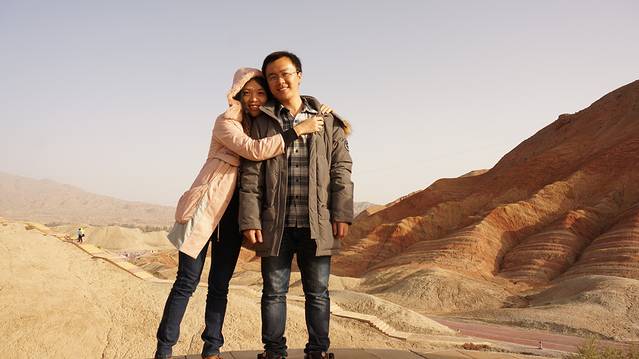 第一次知道七彩丹霞是启鹏在首旅建国实习的时候,他们酒店预计在张掖建一个建国酒店,于是便看到了七彩丹霞的宣传册,当时震撼了,土地为什么会有如此鲜艳的颜色?我心目中的土地,非黑即黄,竟然有彩色的。从未想过,那么快我就能够站在这片神奇的土地上。