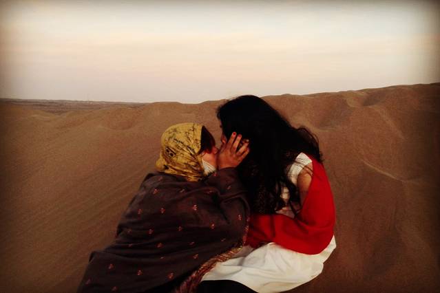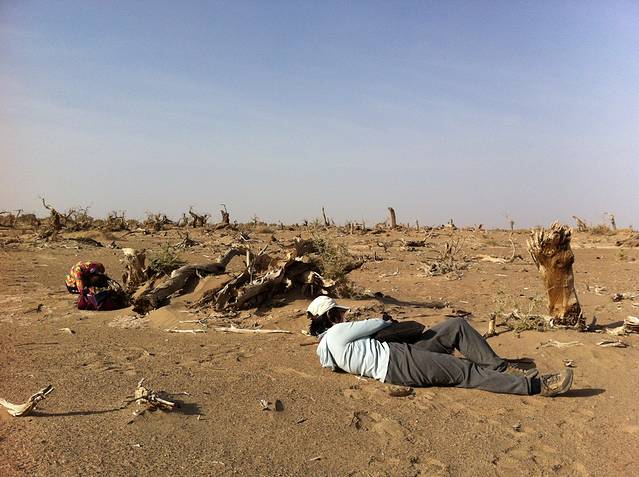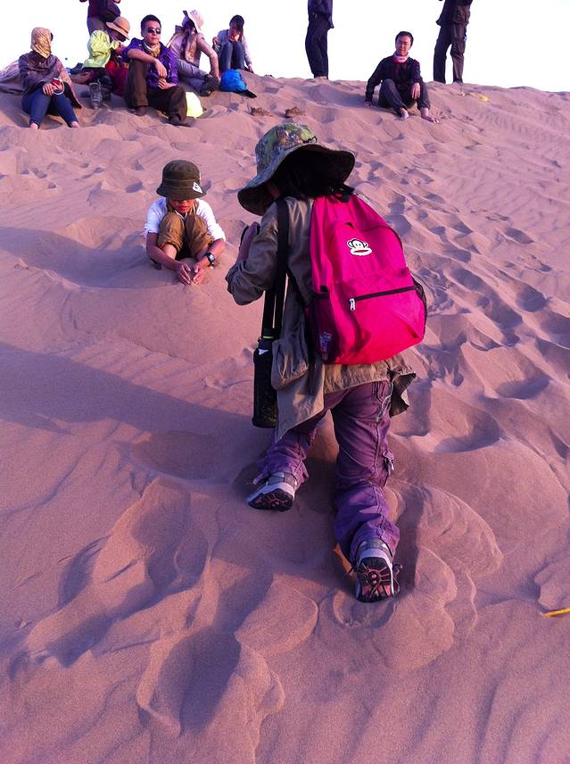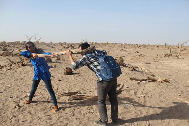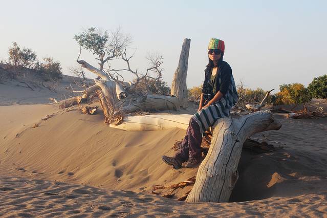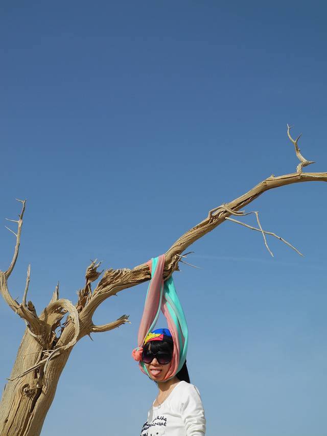 我在沙漠里找到了小树丫、大树丫,跟小丫子拿着合影留念,我至今都后悔没将那个小丫带回来,深深的遗憾,幸好还有照片。与小初一起将两块枯木十字交叉起来,当成跷跷板,童趣无限。一阵疯狂之后,原生质带领着大表哥和启鹏去门口买哈密瓜,我们找到了一棵拍摄日出最好的枯树坐着等他们,将小表妹的围巾挂在树上作为标志,可是他们迟迟都未归,电话信号很不好,找了好一阵才找到,丝毫没有看到挂在树上的围巾。
