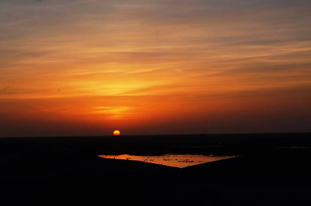 第二天早上被冻醒了,冷得瑟瑟发抖,往睡袋里钻也没用,干脆直接起来。有一帮人已经跟着大部队一起出发往巴丹吉林看日出,我们决定在一道桥看,然后回营地收拾东西,等着大巴来接我们。我跟启鹏在附近找到了一个土坡,旁边已经有一帮人在候着,摆好了三脚架,期待着最壮观的一刻。可是,太阳辜负了大家的期望,迟迟不愿意出来,在旁边叽叽喳喳的中年男子受不了终于离开了,大家觉得没有希望都陆续离开了。渐渐地,太阳出现了影的时候已经升起来了,被层层雾挡着,隐约能窥见黄色,却不是明灿灿的黄。
