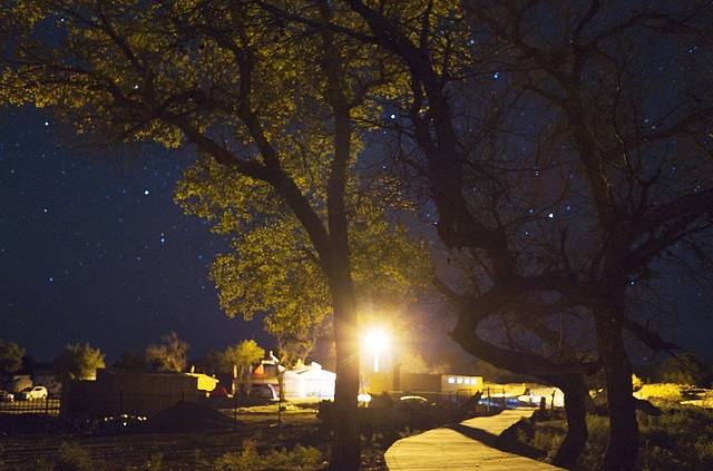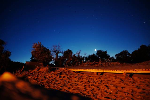 一切就绪之后,睡觉的睡觉,结伴夜游的结伴夜游,我端着碗跟启鹏、原生质、柚子、楼一块儿一边仰望天空,一边往路边走去。之前车子直接把我们送到营地,没有细细欣赏这段小路。在我们啧啧称赞声中,走到了小湖旁边,夜色朦胧,即便在天上亮闪闪的星星笼罩之下,也分辨不清胡杨的颜色,更别提湖中胡杨的倒影。我们专心致志欣赏星空,“看,一颗流星”,耳边惊起了一句话,猛然抬头已经消逝了。我突然就想起了冰心奶奶的《繁星·春水》里面的一句诗:繁星闪烁着,深蓝的天空,何曾听得见他们对语……以前背诵的时候体会不到,现在终于明白了。额济纳的星空能够清楚看见北斗七星、猎户座、银河,仿若粒粒钻石镶嵌,伸手可摘。专注地望着望着,感觉整个星空离我们那么近,仿若下一秒就要整片压下来。“我也看见一颗流星了……”,往手指的方向望去,依旧只是闪亮着的星。以前听说过一句话,“流星飞过的瞬间,就证明这个世界上正在有个人去世”,这些流星,是逝去的人儿还是坠入凡间的天使?在额济纳看到了这辈子最美丽的星空,足矣!