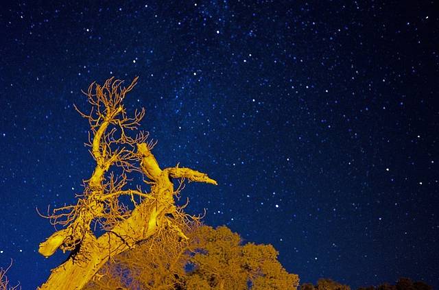 额济纳营地的胡杨与星空,黑色幕布下点缀着颗颗钻石