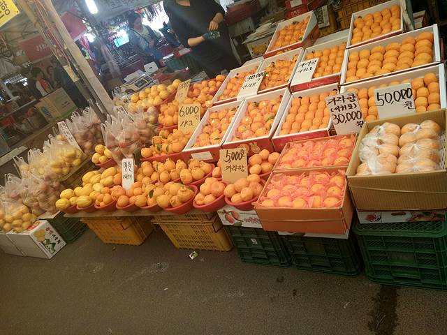 最后一天.把行李放在酒店就出去转了.这个市场听说是7号.或者是挂7的日子才开.我们去的时候刚刚好.市场有很多婆婆.这些婆婆在这里摆摊好像是不收摊位费的.看上去很辛苦.所以我们在一个婆婆那里买了济州特产——橘子.就是丑橘.确实好吃也不贵.3000块5.6个比中国便宜很多