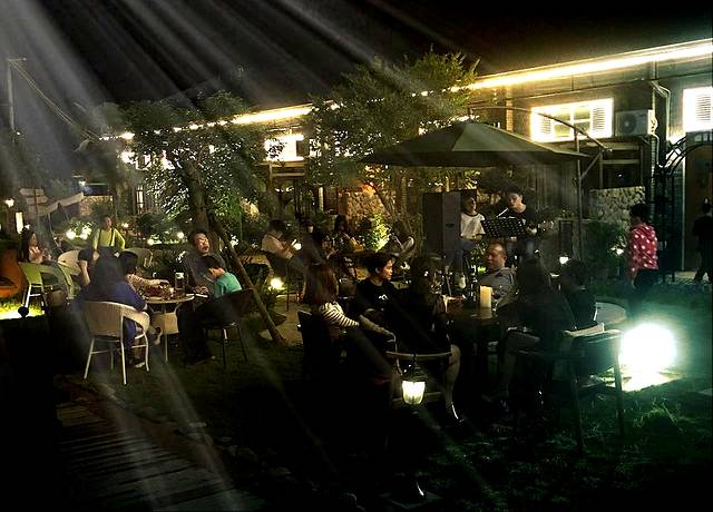 进得客栈再次被惊到,这白天看不到什么客人,到了晚上,院子倒是热闹起来。清吧的卡座、高脚椅、户外的阳伞下几乎坐满了。我也兴起找个角落坐下顺便点了杯汽酒,悠扬的音乐回荡,四月的夜还有点冷,我突然觉得如果是夏夜,星光闪烁,坐在这闭上眼会不会伸手就能触碰到某一年的某一天呢~
