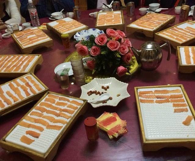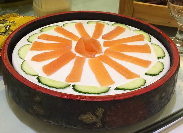 我们点的现杀三文鱼(要吃鱼“现杀”这两字就秒杀一切好么?),这条鱼3斤7两,切片的鱼生有4盘,鱼头开汤,鱼骨煮粥,鱼皮凉拌