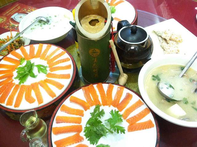 我可是纵横三文鱼界好多年,来个客观评价:东江湖的三文鱼不似挪威冰鲜三文鱼的肥美,个头偏小些,肉质稍薄,但新鲜,更有弹性。当然,这可是看着店家现杀现片哟,新鲜得不要不要的。行情几乎都是38元/斤,一鱼四吃,这做法、口感真不是冰冻鱼能相提并论的。