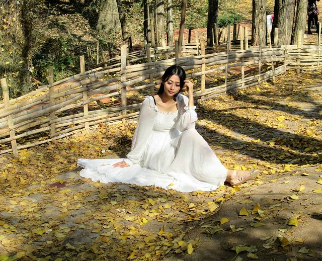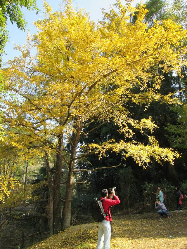 坳背村的千年银杏与银杏林就位于老坪田镇附近。秋风掠过,林中随即掀起一阵“黄金雨”,满地尽披黄金甲,浪漫异常!再迟些来秋叶就要掉光啦!一只美艳“白狐”突然出现在金黄的银杏林中——人家摄影采风团的模特(挺美的,就是妆有点浓),俺也不失时机地偷拍了一张。说真的!俺对这类模特摆造型的摄影没啥兴趣,也不懂欣赏,还是更爱拍大自然的天生丽质。