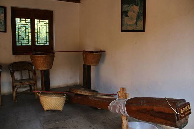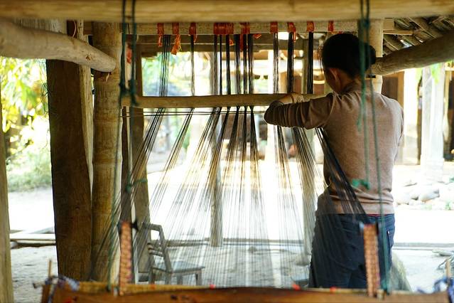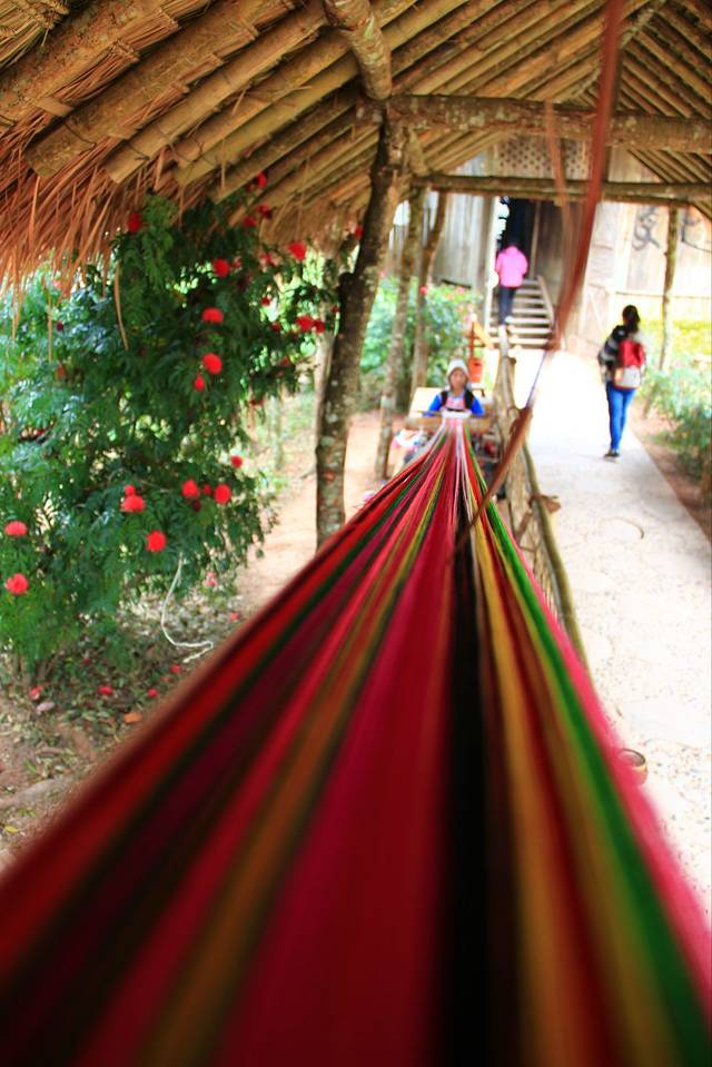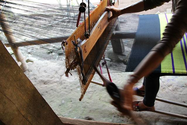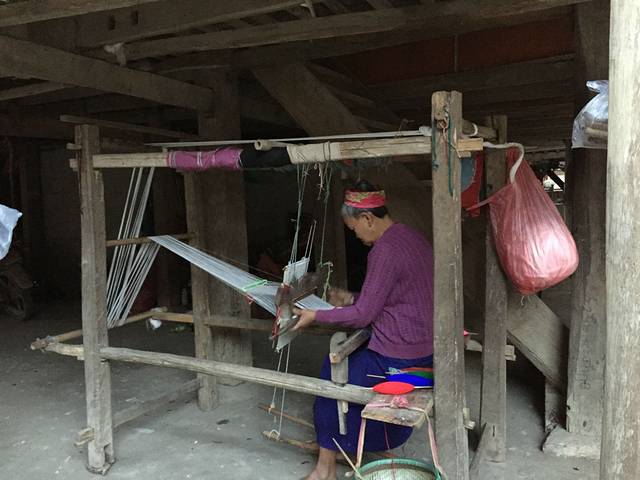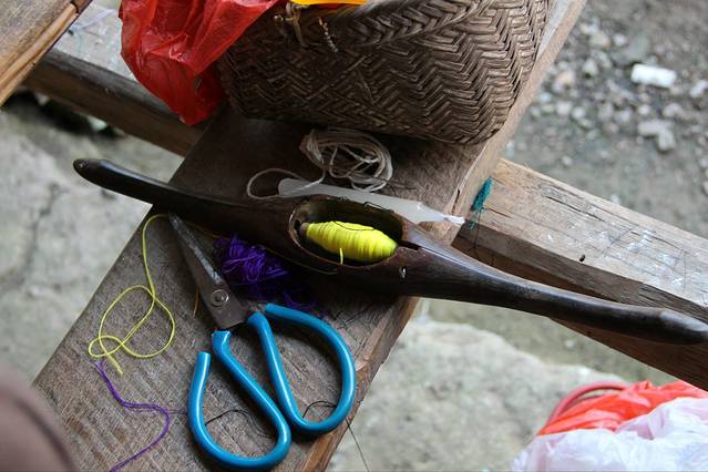 这样的织布机子前面有看到过,仔细看了下它的工作机理。看起来蛮简单的!左右手的穿梭,板的压制,双脚的配合,然后就是时间的等待。便能织出一匹布。