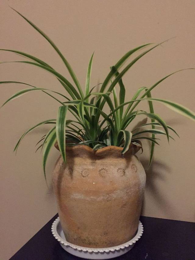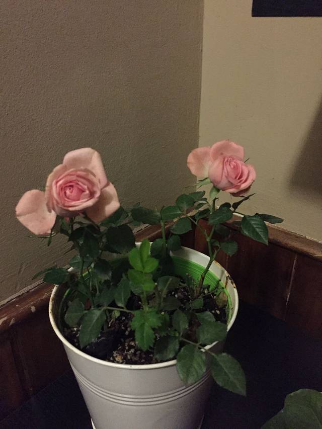 楼梯拐角处盛开的粉玫。还有吊兰