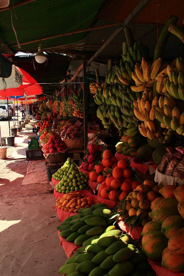 途中偶遇水果市场,各种样的热带水果。香蕉和芭蕉傻傻的挂在那里。