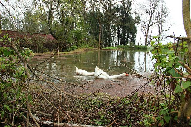 在一块梯田里嬉游的两只白鹅。云山雾水之间,不羡仙!