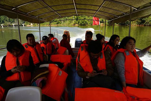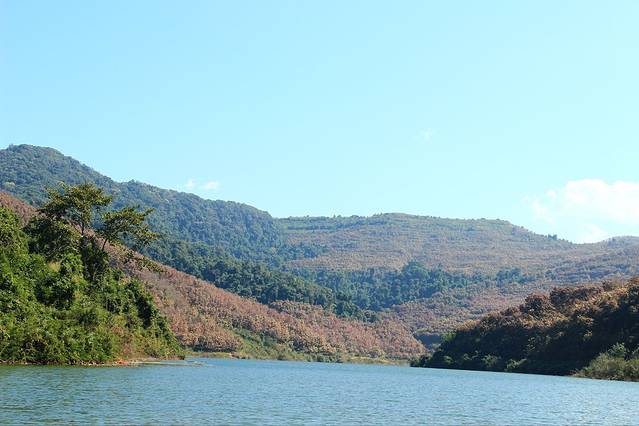 从望天树出来,咱们便坐船游了南腊河。漫山的橡胶树都是金灿灿的!