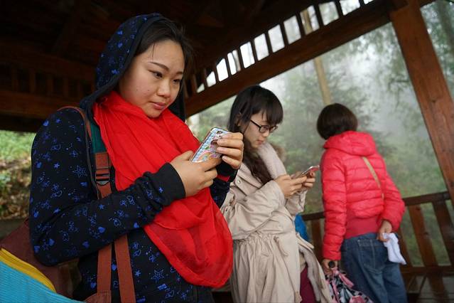 姑娘,告诉我,你们都在上网看老虎嘴是么?其实我们是在小亭子里躲雨。在下观景台的路上,云越来越厚,雨便随着来了。我心忧伤!