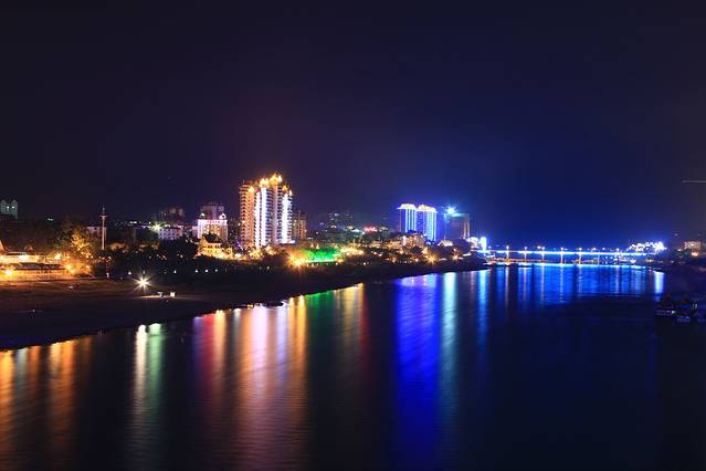 跟走走四人以及小与、阿玛吃完烧烤。阿玛去赶飞机,我和小与就来到了版纳大桥。拍版纳的夜景。