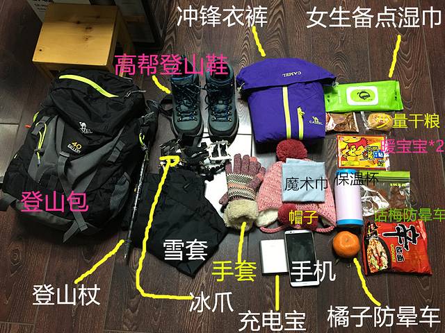 冰爪、雪套、登山杖(2只比较好)、手套(我推荐触屏手套)、帽子、围巾、保温杯。