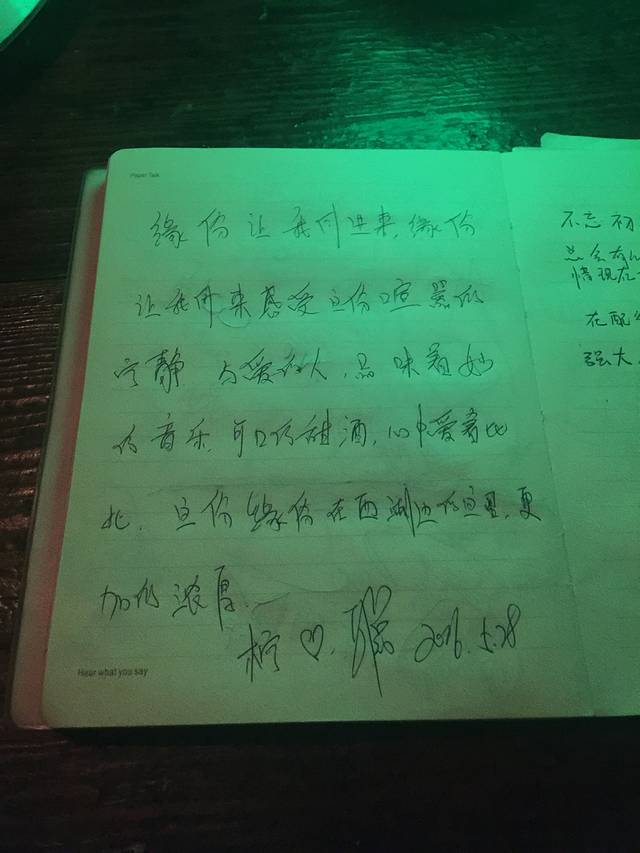 桌子上的留言本,虽然写字难看,文采不行,可我还是想在这个美丽的城市留下我们的印记,也许有一天,我们再有机会回到这个西湖边的小酒馆,可以再次看见曾经年轻的我们留下的青涩的回忆。