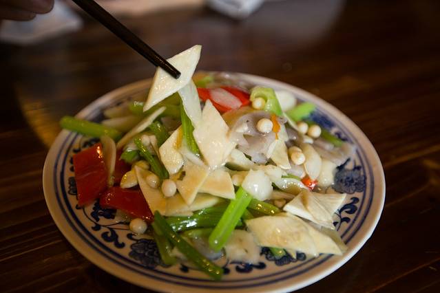 住下之后就去小眸园老板推荐的对面的饭馆吃饭,虽然是家常菜,但是很好吃。这个菜叫荷塘月色,用的都是水里的菜做的,很好吃。