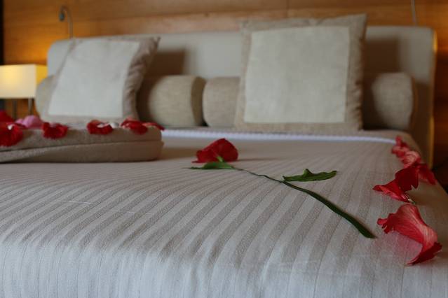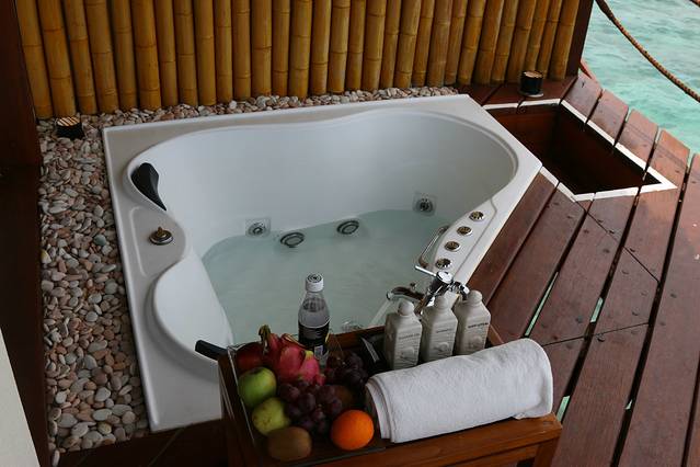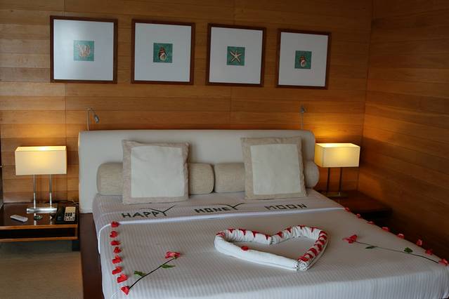 管家这我们的来到水屋,果然大爱,房子特别漂亮,管家会一一给我介绍房屋的各种功能,音响,咖啡机,按摩浴缸等等的使用方法,并安排好了我们接下来沙滩的烛光晚餐,日落巡航,双人spa等项目的日期时间。这里提一下我给小费的安排,管家5美元一次就可以,每天早餐给一个小礼物(中国结,某宝非常多,1块出头一个),中餐1美元,晚餐2美元,打扫房间卫生每天2美元,行李一个一美元,spa的时候送了按摩师一人一个,其实小费这个东西不是一定要给的,凭自己的习惯和服务质量来决定,不必装大头花冤枉钱,我看基本上老美子基本都不给,我给是因为我觉得对我的服务非常用心,等管家介绍完走后,赶紧赶紧拿出相机,把水屋别墅第一天最漂亮的布置拍下来。